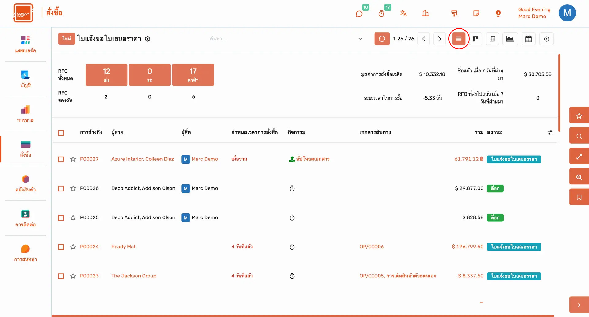 - เมื่อกำหนดกิจกรรมเรียบร้อยแล้ว ผู้ใช้งานสามารถดูกิจกรรมที่จะเกิดขึ้นได้ในหน้ารายการใบแจ้งขอใบเสนอราคา หรือ ใบสั่งซื้อ ได้ดังรูปภาพด้านล่าง